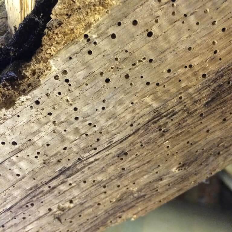 Если пораженный участок большой, нужно воткнуть в поврежденное место нож или шило. Если инструмент входит легко, то повреждения значительные. В этом случае пораженный материал необходимо удалить и сжечь вместе с вредителями. Потом здоровую древесину обработать инсектицидом и антисептиком и в место выемки поместить новый брус. Если древесина достаточно крепкая, но площадь повреждения большая, обработку инсектицидами следует повторить несколько раз.